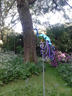Soms kom je door een beeld tot verrassende ontmoetingen. Zo ook met het beeld van een pauw, op een zomerse markt in Juni verkocht ik dit beeld aan een jonge dame. Ze wilde hem graag hebben maar kon hem niet meenemen, gelukkig was het dicht in de buurt van de markt dus bezorgen aan het einde van de dag was geen probleem. En dan kom je in een prachtige tuin terecht met meerdere verrassende beelden. Enige trots vervulde mij dat een beeld van mij tussen deze collectie mocht staan. De pauw moest een plekje rond een grote boom krijgen want dat was de slaapplek geweest van een echte pauw die helaas was overleden. Wat mij betreft was het alsof het beeld gemaakt was voor deze locatie en ook de kleuren konden niet beter passen. Ik hoop dat het beeld er nog lang mag staan en wie weet vliegt hij ’s nachts de boom wel in voor een beetje rust.