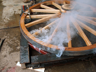 Iets wat mij nooit verveeld is het leggen van wielbanden. Om te zorgen dat het houten wagenwiel zijn stevigheid krijgt, wordt er een ijzeren band omheen gelegd. De band wordt in eerste instantie kleiner gemaakt dan het wiel. De ijzeren hoepel wordt in het vuur roodheet gemaakt zodat hij uitzet en om het wiel past. Snel wordt de hete band om het houten wiel gelegd. Als de band goed om het wiel ligt is het natuurlijk zaak om het hete ijzer snel te koelen met water zodat het hout niet verbrandt.